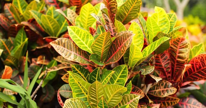 This is the most common croton cultivar that you will find in many nurseries and garden centers. Elliptical green leaves are lavishly veined in yellow and red.