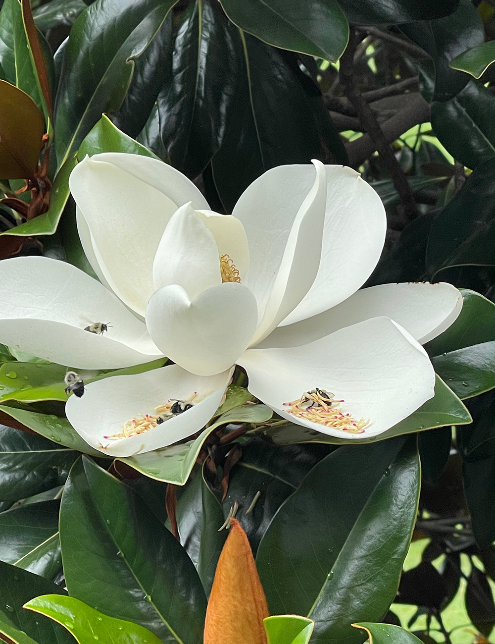 A bloom of southern magnolia (Magnolia grandiflora, Zones 7–9), hopefully attracting pollinators.