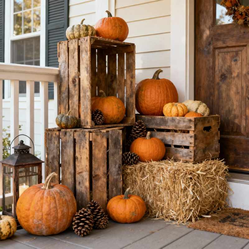 Using wooden crates as the base of your display adds rustic character. Stack crates vertically or place them sideways for pumpkins to “spill” out naturally.