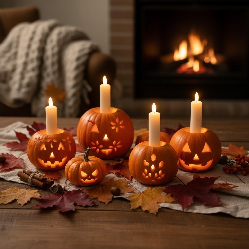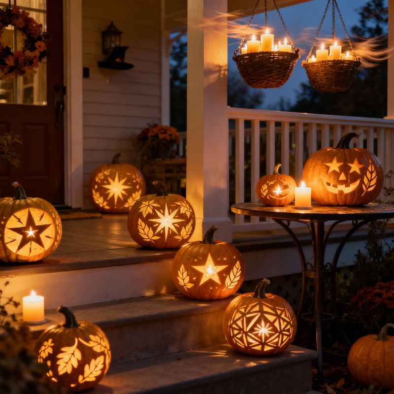 Carved lantern pumpkins instantly bring a magical glow to your porch. Instead of classic faces, try carving starbursts, leaf designs, or geometric patterns for elegance.