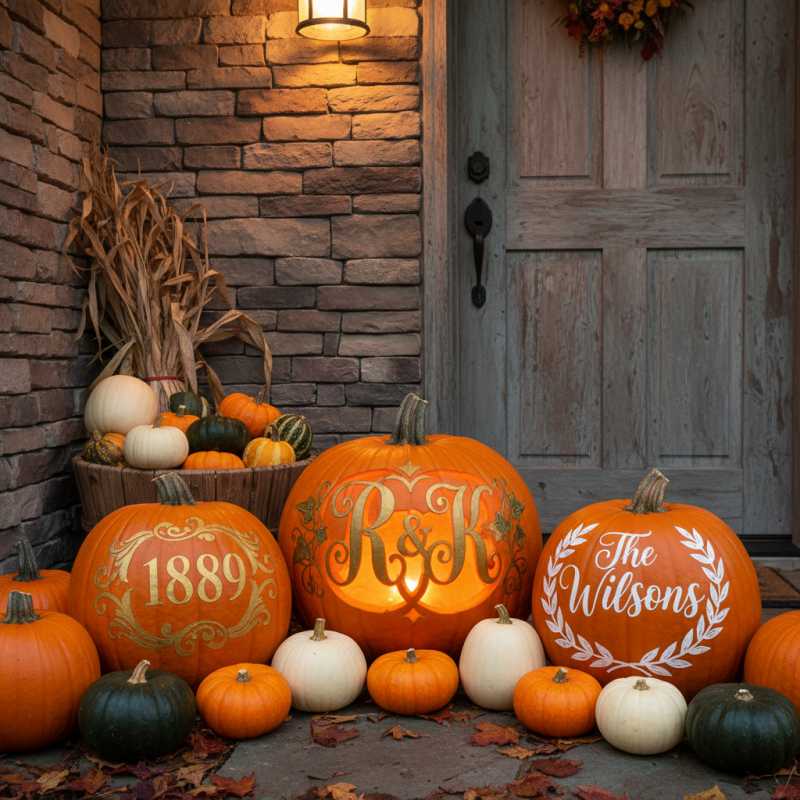 Pair monogrammed pumpkins with plain ones for balance. The mix of simple and detailed designs keeps the display from feeling cluttered.