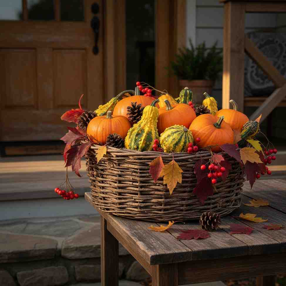 Filling a basket with pumpkins and gourds creates a cozy, rustic vignette. Woven baskets add texture and warmth that feels very autumnal.