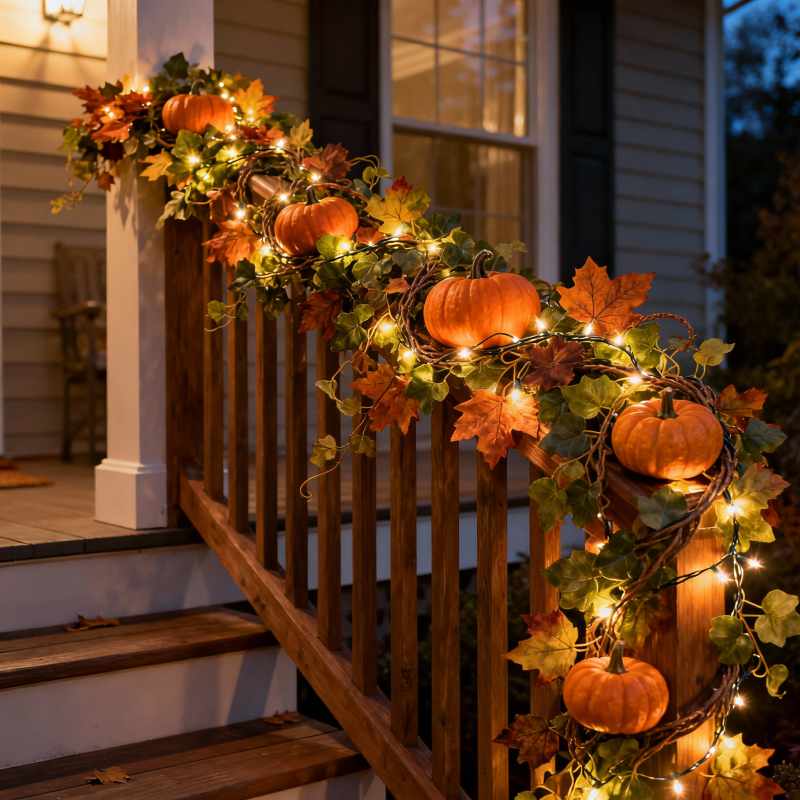 The garland can stretch across your whole porch or be draped in sections for a subtler effect. Small pumpkins tucked along the greenery add charm.