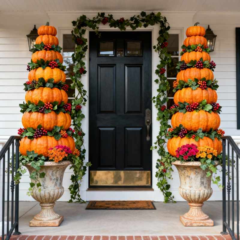 Pumpkin topiaries bring a neat, structured look to your porch. They’re usually stacked in decorative urns or pots, which makes them look intentional and polished.