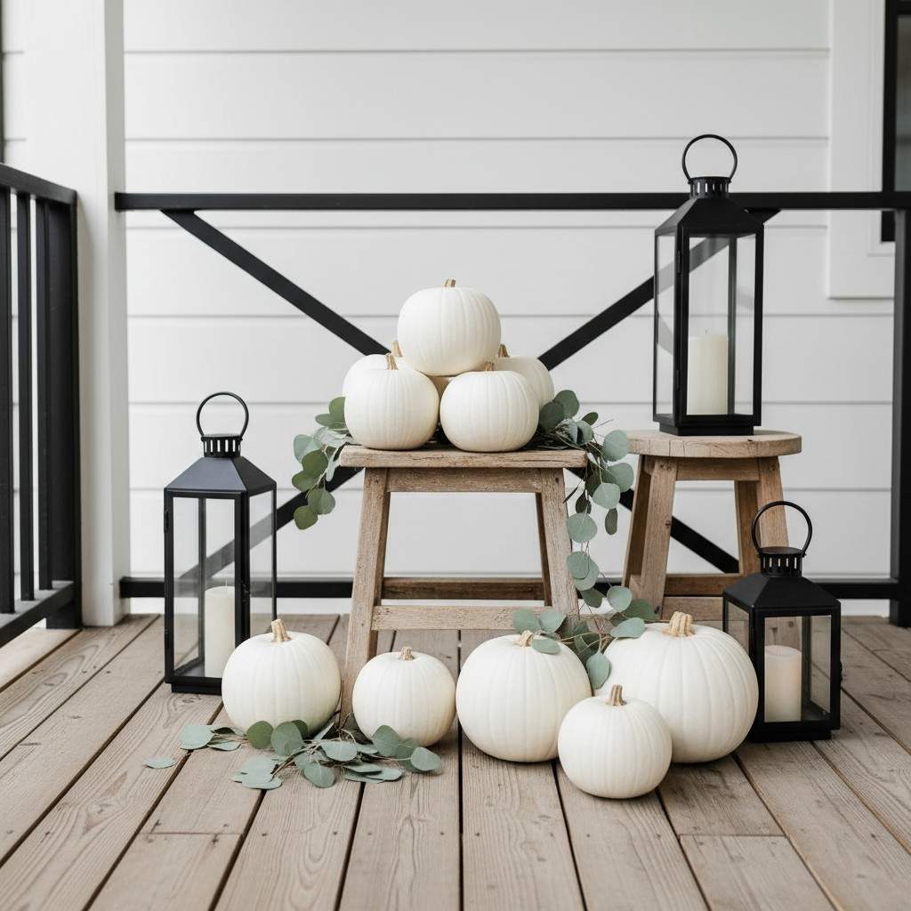 Using all-white pumpkins creates a clean, modern aesthetic. Their neutral color blends seamlessly with both rustic and contemporary porch designs.
