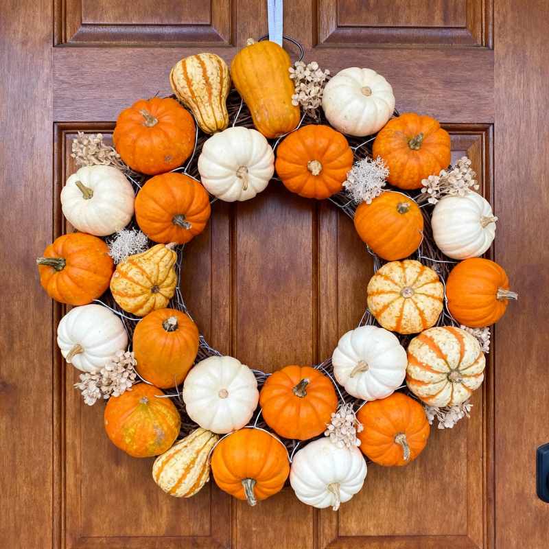 A pumpkin wreath turns your door into the centerpiece of your décor. Small pumpkins and gourds can be attached with wire or hot glue for a sturdy design.