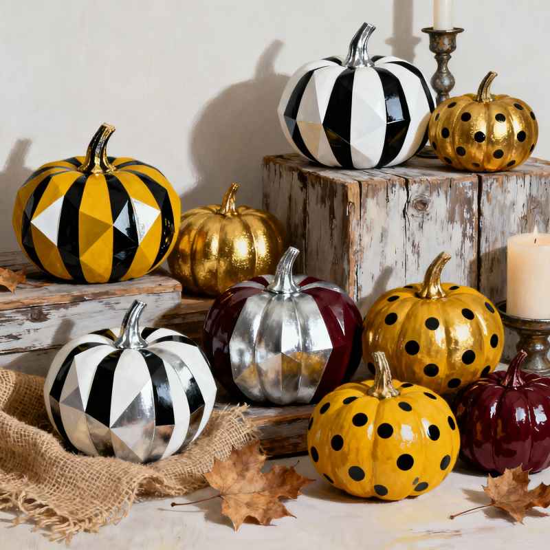 Group painted pumpkins in clusters or pair them with neutral décor. Their smooth, bold look pops against natural wood or rustic baskets.