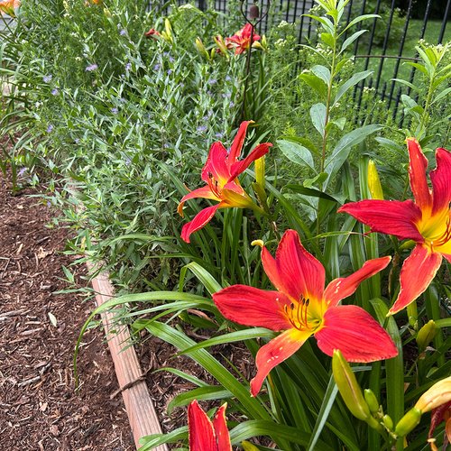 I have two large beds that started as daylilies of all sizes and colors, which are wonderful for St. Louis, but as the deer have become more frequent, I’ve moved in some bluebeard (Caryopteris incana, Zones 5–9) and slender mint (Pycnanthemum tenuifolium, Zones 4–8). They keep blooming when the deer snip off the daylily buds!
