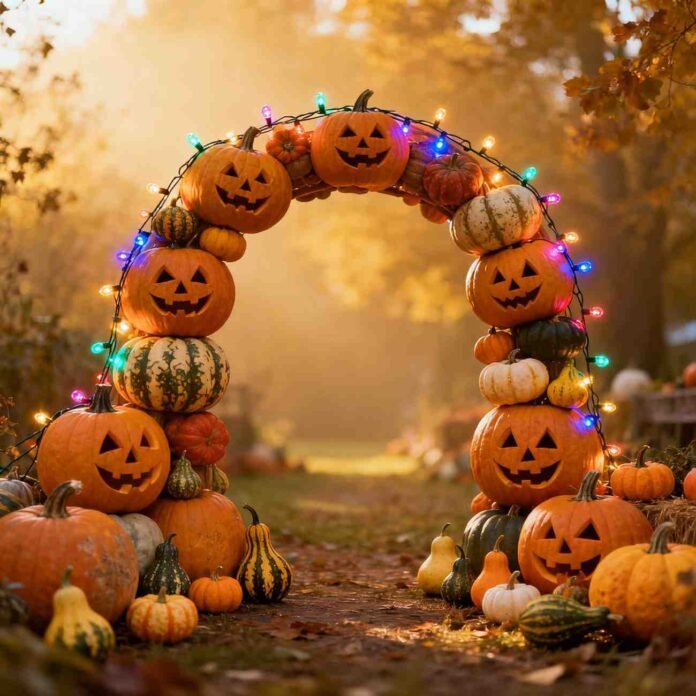 A pumpkin archway instantly transforms your front path into a festive Halloween gateway. Use a sturdy base of wire, wood, or PVC pipes, and stack a mix of carved, painted, and faux pumpkins. Wrap the frame with twinkling orange or purple string lights to give the arch a warm, eerie glow after sunset.