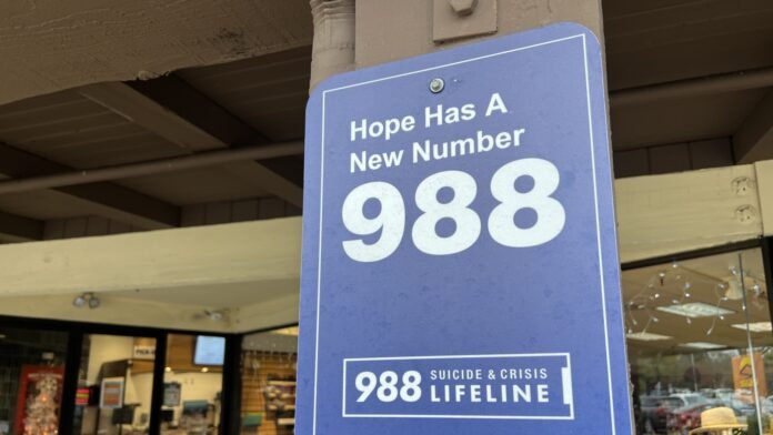 Sign for the 988 Lifeline mental health emergency hotline, Walnut Creek, California, December 20, 2024. The Trump administration has laid off more than 100 employees at the agency responsible for overseeing the number.