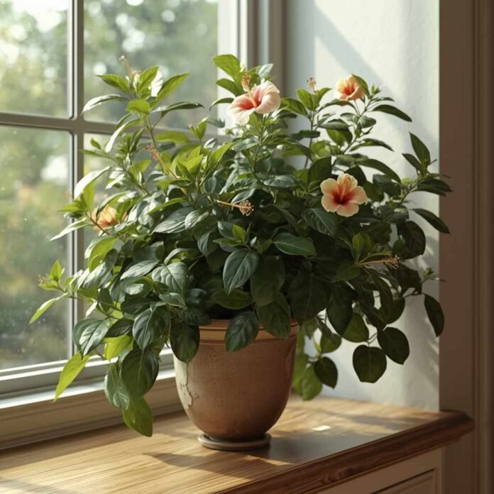 In dry climates, mist the plant regularly or place a humidity tray nearby. Sudden temperature fluctuations stress the plant and affect flowering. Indoor hibiscus should be kept away from air conditioners and heating vents.
