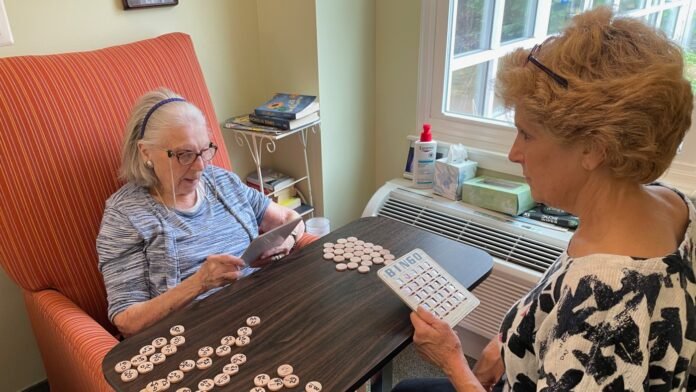 Rita Orr, 94, and her daughter Janice Rogers sit across a small table from each other to play Bingo.