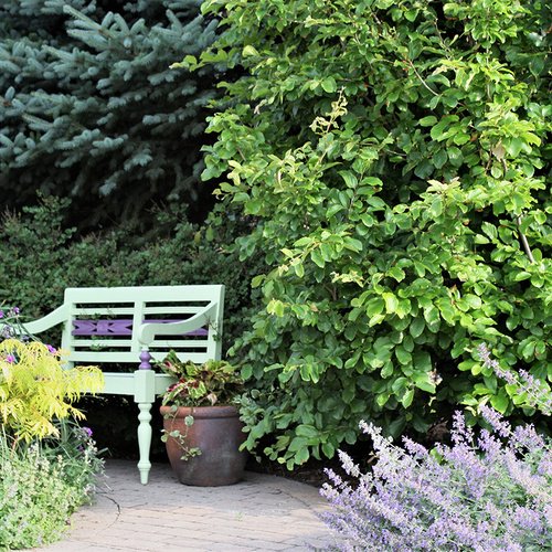 This photo really highlights the calm, cool vibe of John’s garden. While the patio is dominated by hotter colors, greens in purples in other areas of the garden provide a wonderful sense of serenity. A mint green and purple bench is the perfect accent in this vignette, and must be a lovely spot for a quick pause.