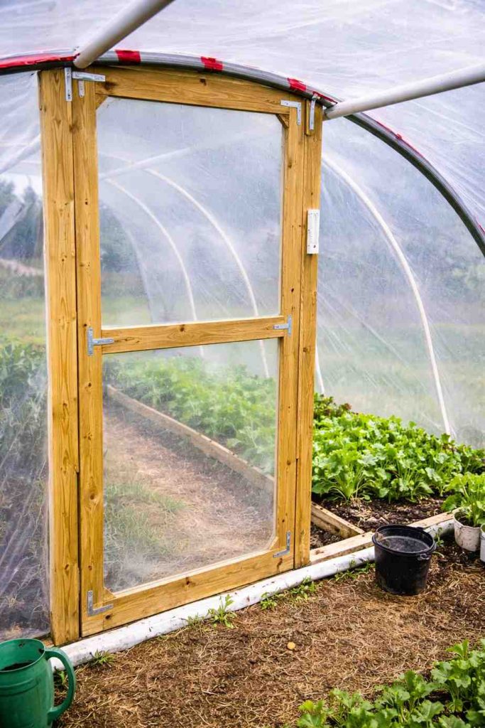 Doors and roof windows are built to fit snugly and allow airflow. The structure is finished by stretching UV-resistant polythene over the frame and securing it with wooden battens.