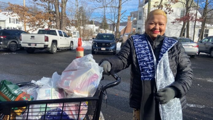 Marilyn Vargas, who supports a household of six, gathers food donations at a pop-up food pantry held outside the Easthampton Community Center in Easthampton, Massachusetts.