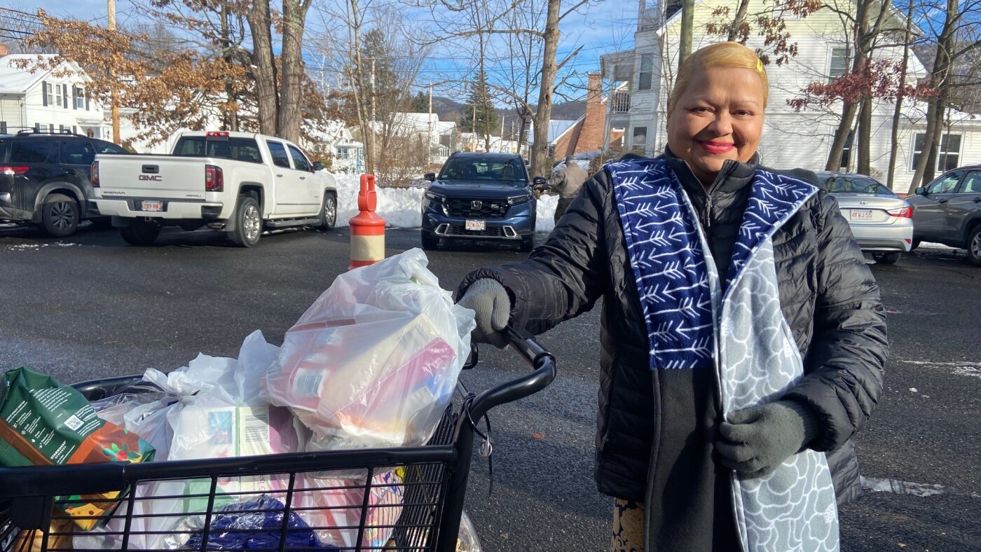 Ramona Kallem, a volunteer, helps distribute food at the twice-a-week food bank outside the Easthampton Community Center.