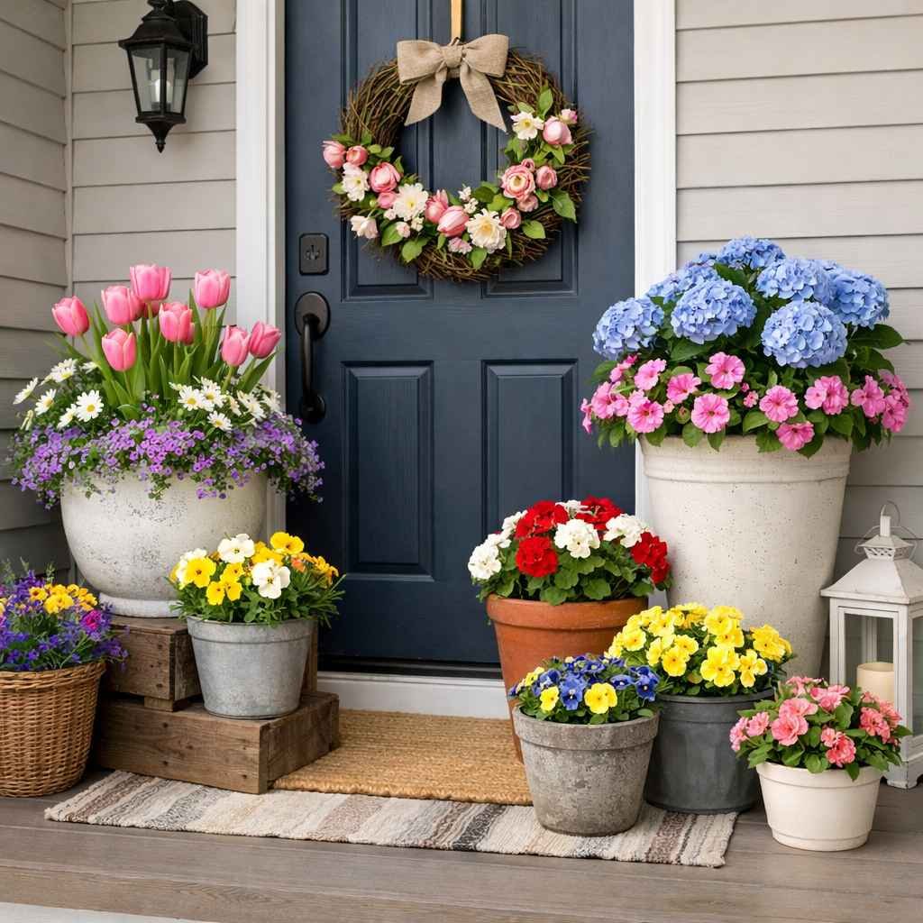You don’t need anything fancy—simple pots filled with seasonal blooms work beautifully. Think pansies, petunias, daisies, or whatever’s available locally. Mixing a few colors creates a relaxed, cheerful look without feeling overdone.