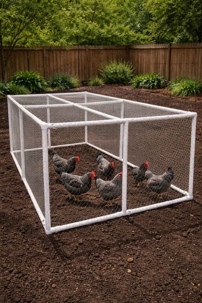 The PVC pipe chicken tractor is a lightweight and budget-friendly option. It’s quick to assemble using PVC pipes, netting, and simple connectors.