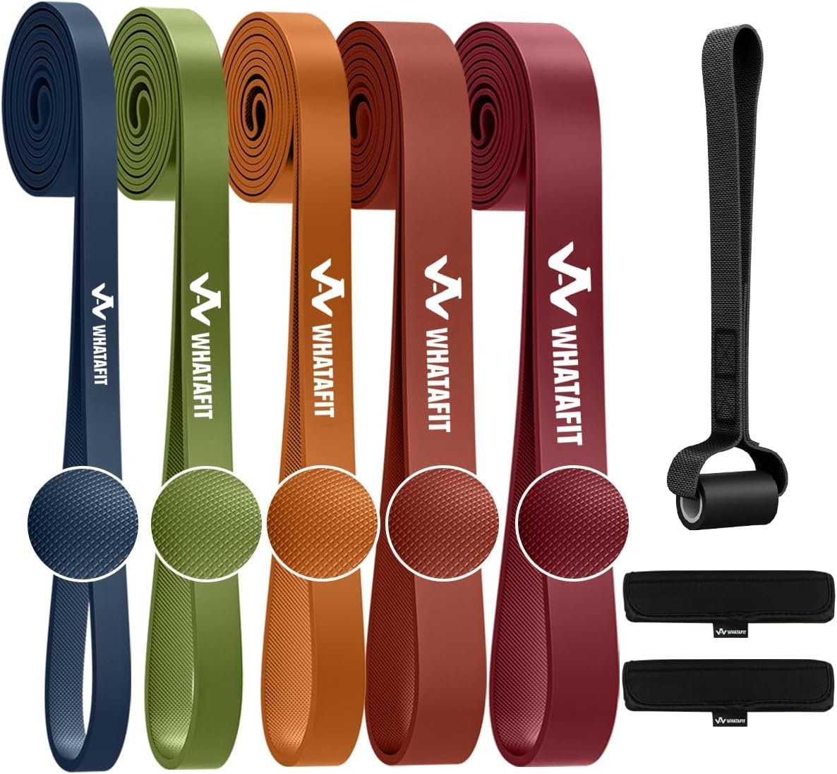 [Professional 5-Level Progressive System for Varied Training Goals] The WHATAFIT resistance bands set features 5 color-coded bands with progressive resistance levels, from lighter to stronger. This design allows users to adjust intensity according to their training phase, supporting various exercise needs like toning, strength training, or assisted movements such as pull-ups with one versatile set