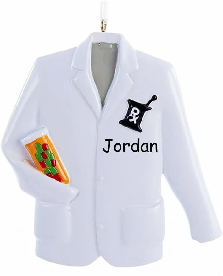 Honor the essential heroes of healthcare this holiday season with the Pharmacist Christmas Ornament, a thoughtful and detailed keepsake that celebrates dedication, compassion, and professionalism. Whether you’re gifting a pharmacist, a pharmacy student, or a healthcare worker, this ornament beautifully captures the spirit of the profession and the joy of Christmas. The design showcases a white pharmacist lab coat, complete with front pockets, folded collar, and the traditional RX mortar and pestle symbol, representing the art and science of pharmacy. Tucked into one pocket is a bright orange prescription pill bottle, symbolizing the pharmacist’s commitment to patient care and precision. Each piece is carefully hand-painted to highlight the details that make it both realistic and meaningful. Made from high-quality polyresin, this ornament is lightweight yet durable, designed to last through years of holiday celebrations. Measuring approximately 3.5 inches tall, it’s perfectly sized to hang from your Christmas tree, office décor, or gift packaging. The glossy white finish catches the light beautifully, while the golden hanging cord adds a professional yet festive touch. Personalization makes this ornament truly special — add a name, year, or custom message to create a one-of-a-kind keepsake that honors the pharmacist or pharmacy student in your life. It’s a heartfelt gift for recent graduates, seasoned professionals, or coworkers in the medical field who make a difference every day. Perfect for Christmas, graduation celebrations, or even National Pharmacist Day, this ornament brings a personal and joyful element to any holiday setting. It serves as both a symbol of dedication and a reminder to take pride in the work that keeps communities healthy. Whether displayed on a Christmas tree, in a pharmacy office, or among other medical-themed decorations, the Pharmacist Christmas Ornament is a timeless way to show appreciation and gratitude for the people behind every prescription. Make this year’s holiday extra meaningful by giving a keepsake that blends professionalism with festive cheer.
