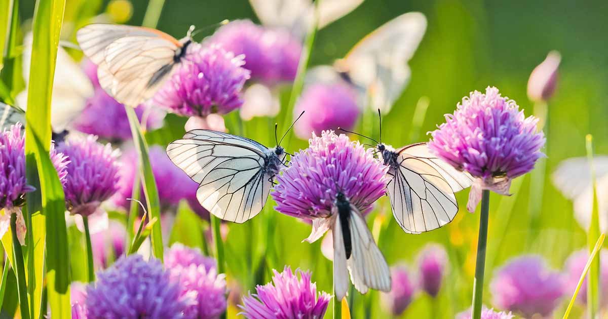 A close up horizontal image of Pieris butterflies feeding on pink chive flowers pictured in light sunshine on a soft focus background.A close up horizontal image of Pieris butterflies feeding on pink chive flowers pictured in light sunshine on a soft focus background.