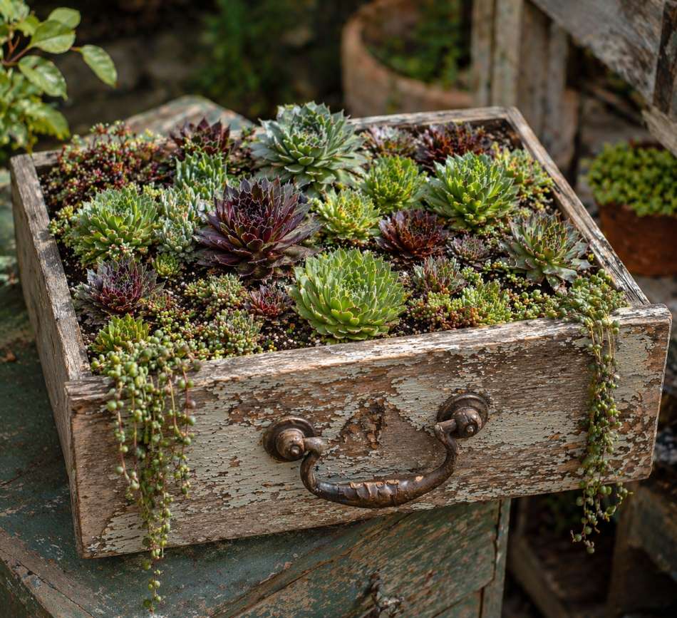 An old drawer can make a surprisingly charming planter, especially if you like that slightly vintage, lived-in look. The wide, shallow shape works well for hens and chicks, giving them enough room to spread without needing too much depth.