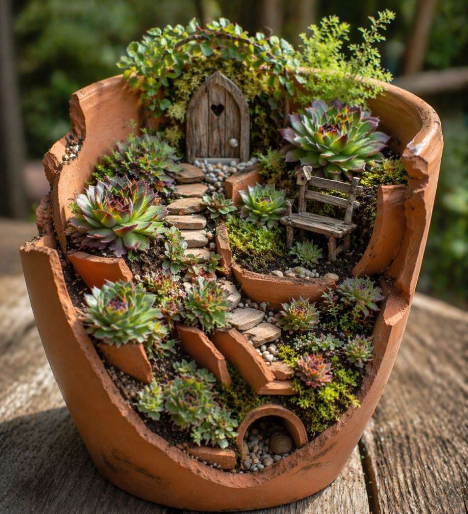 A cracked or chipped pot doesn’t have to be thrown away—in fact, it can turn into one of the most eye-catching planters for hens and chicks.