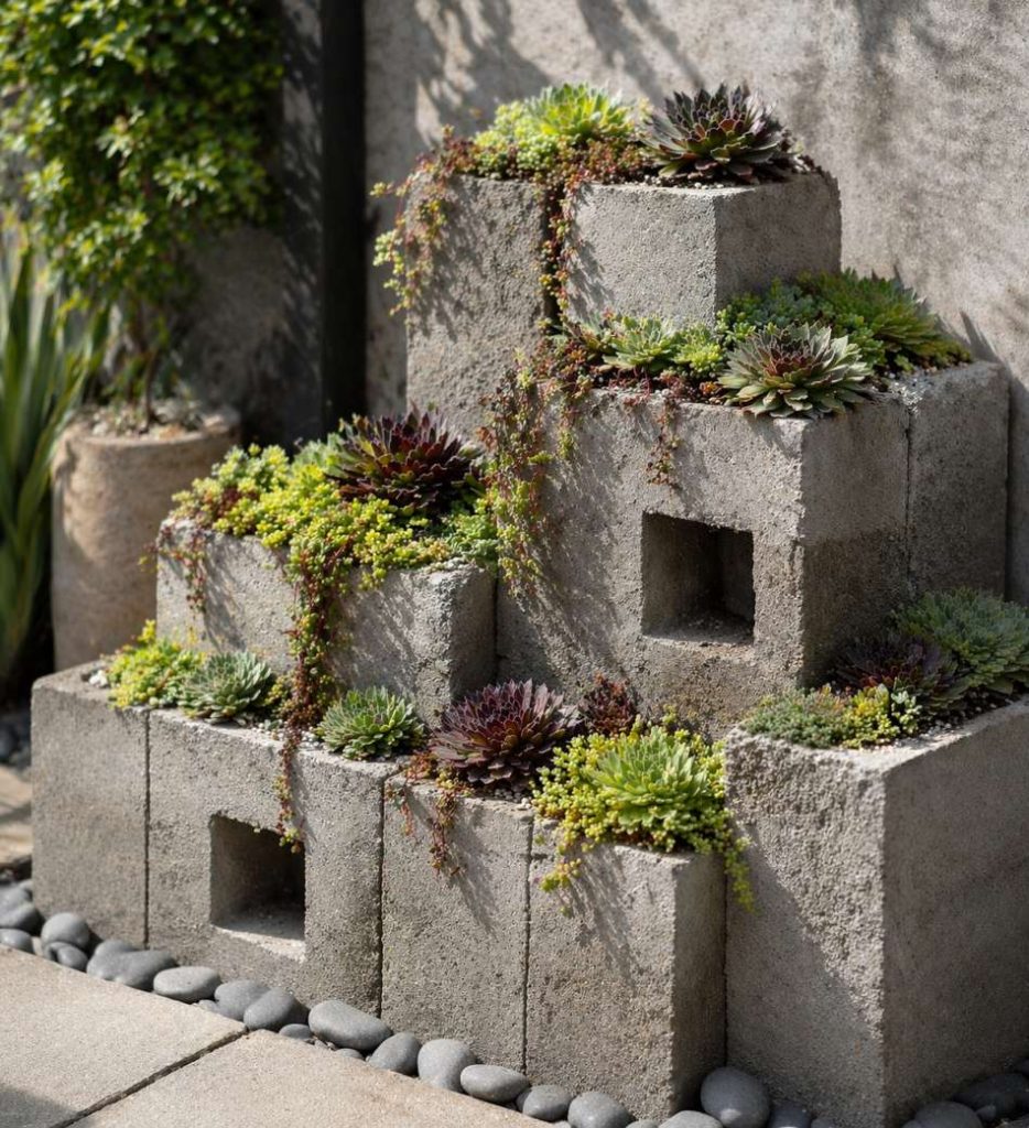 Concrete blocks might seem plain, but they’re actually perfect for hens and chicks. The built-in openings act like ready-made planting pockets, and the rough, industrial look contrasts nicely with the soft, rounded rosettes.