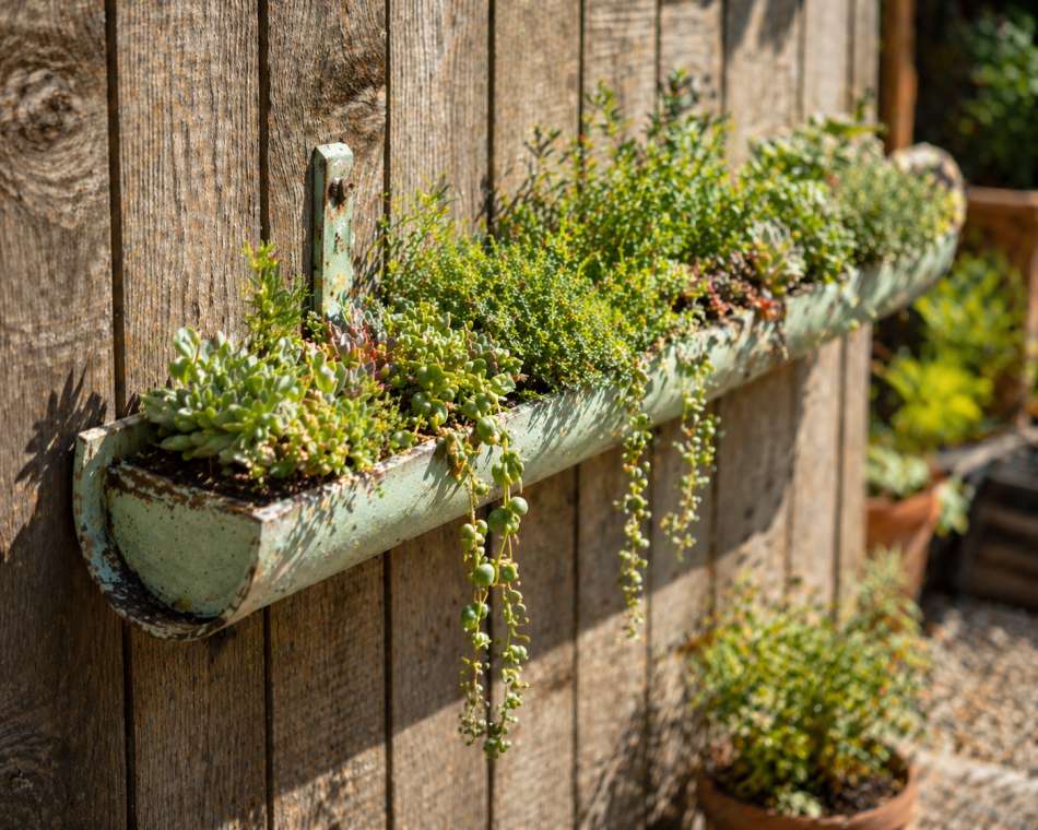 A section of old gutter can be turned into a long, narrow planter that’s perfect for lining a wall or railing. Its shallow depth suits hens and chicks really well, and the length gives you space to create a continuous row of rosettes.
