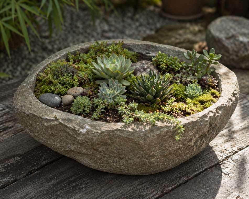 Because stone tends to stay cool and stable, it helps create a comfortable environment for the plants. Add a layer of gravel, then arrange your hens and chicks with a bit of spacing so they can fill in over time. It’s a quiet, low-key planter that looks better the longer it sits in place.
