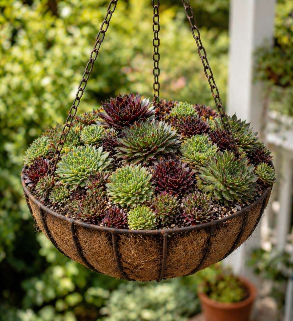 Hens and chicks aren’t just for ground-level displays—they can work beautifully in hanging baskets too. While they don’t trail like some plants, the chicks will gradually fill out the basket, creating a full, rounded look that’s neat and compact.