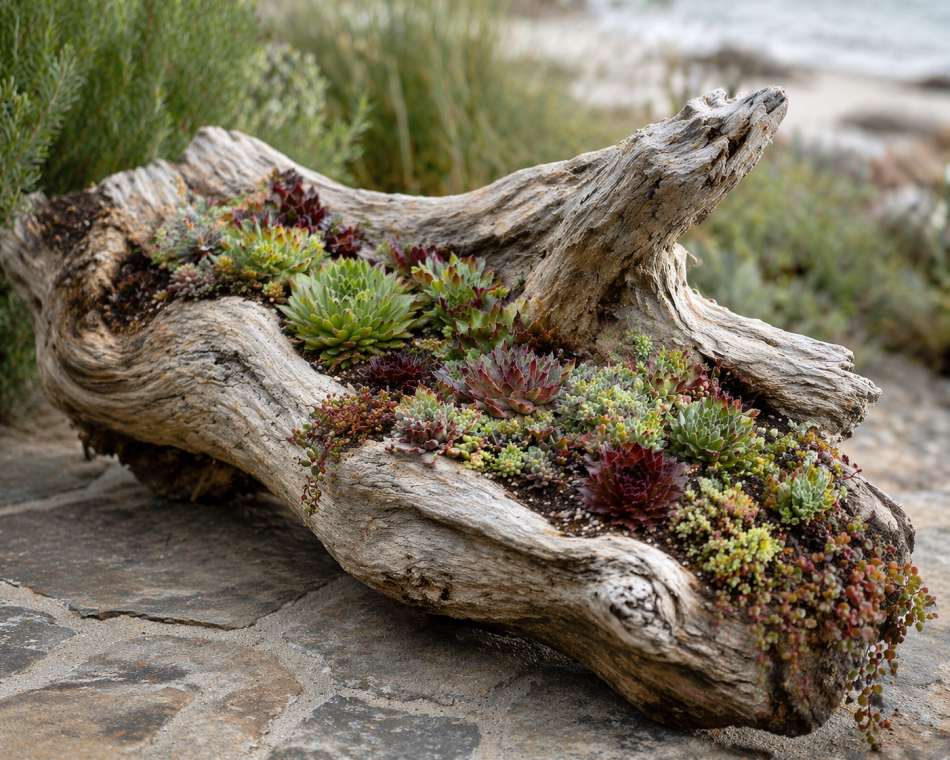 A hollowed-out log or a piece of driftwood brings a really organic feel to your hens and chicks display. The rough, uneven surface contrasts nicely with the neat, geometric shapes of the plants, making the whole arrangement feel balanced and natural at the same time.