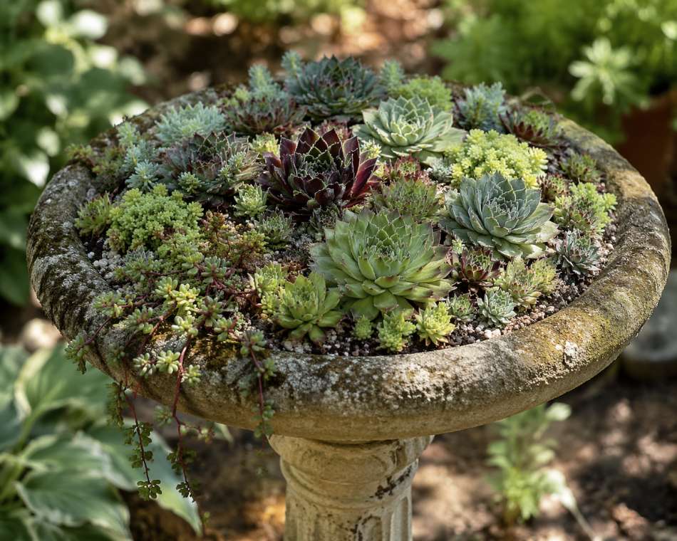 An unused birdbath can easily double as a wide, shallow planter for hens and chicks. The broad surface gives you room to play around with different sizes and varieties, creating a layered look that feels natural and a bit sculptural.