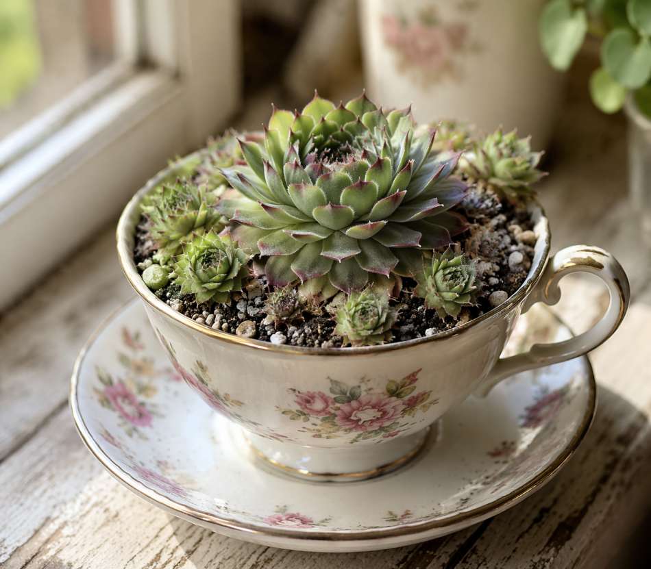 A teacup might not be the first thing that comes to mind for planting, but it’s surprisingly perfect for hens and chicks.