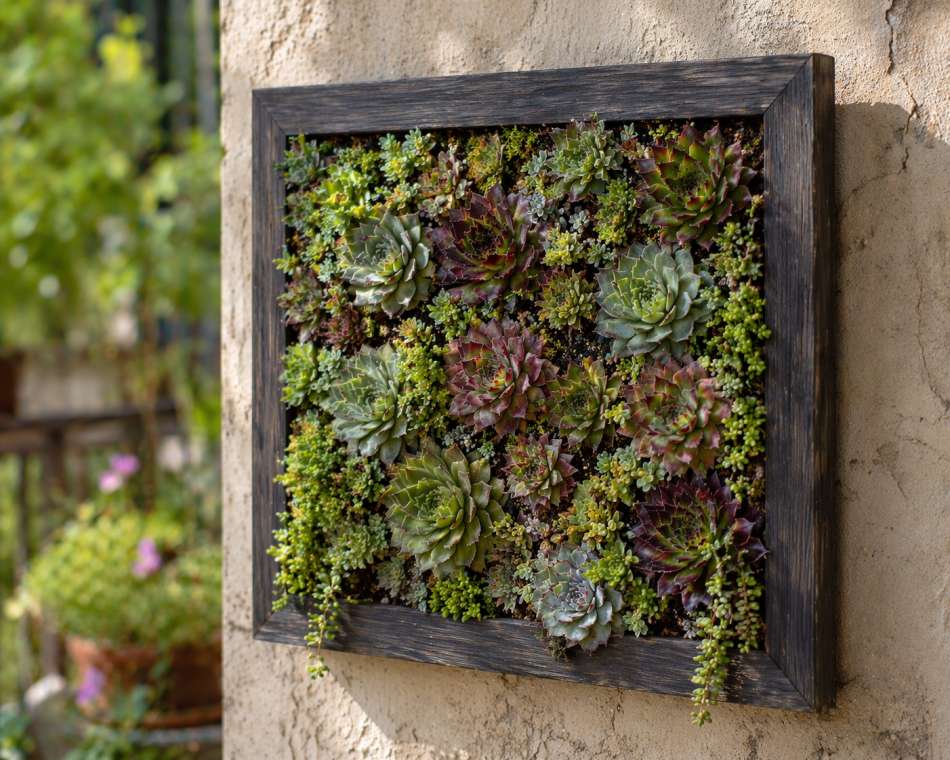 If you’re short on space, a wall-mounted frame can turn hens and chicks into living art. These shallow frames are perfect because the plants don’t need much soil, and their rosettes stay compact without getting messy.