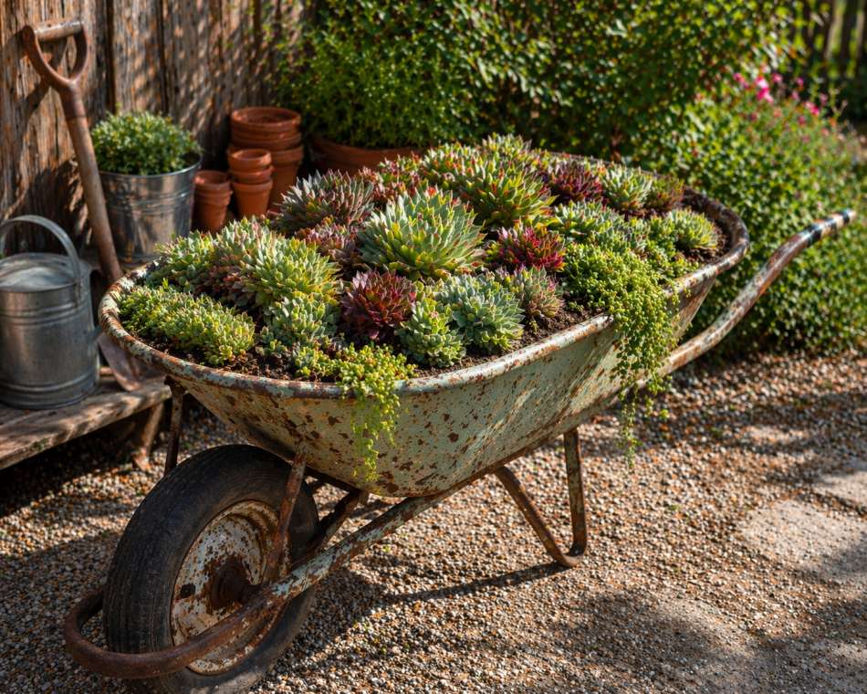 Fill it with well-draining soil and arrange your plants loosely rather than packing them in. The slightly tilted shape of a wheelbarrow also helps with drainage, which these plants appreciate. Over time, it develops a full, natural look that feels established and easygoing rather than overly styled.