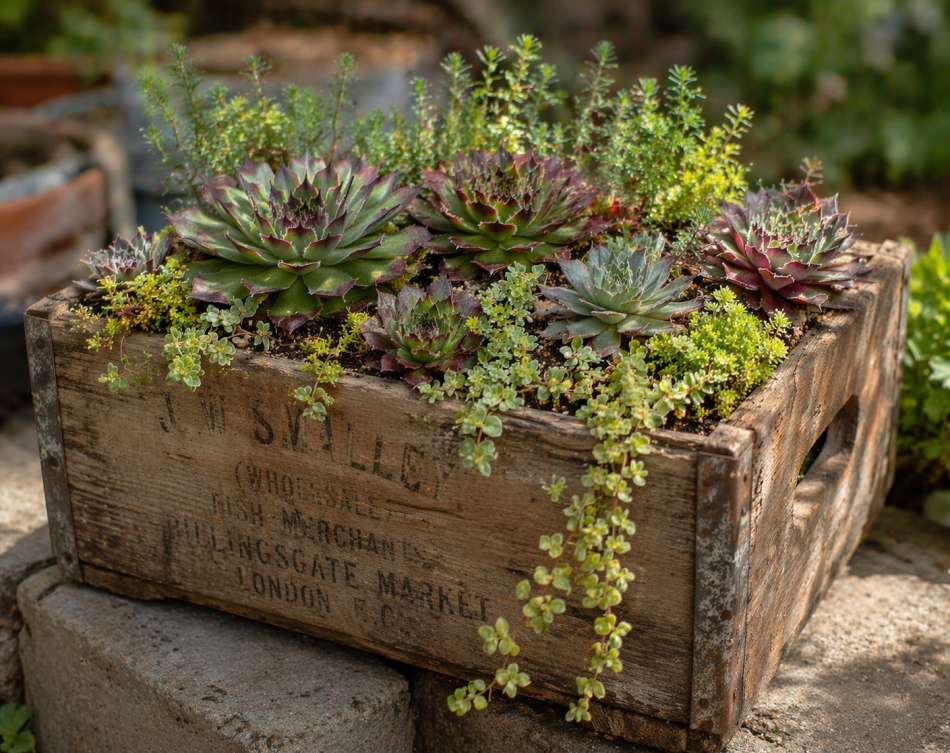 A small wooden crate gives hens and chicks a more rustic, laid-back setting to grow in. It’s a good option if you want something that looks relaxed but still thoughtfully put together.